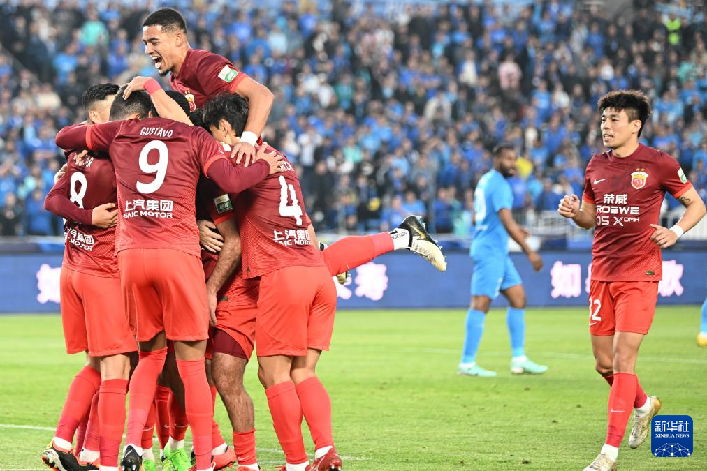 4月9日,上海海港队球员庆祝进球。新华社发(王须中摄)