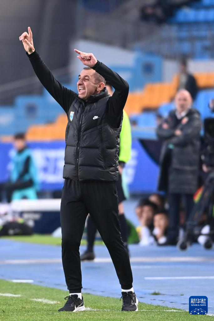 4月9日,上海海港队主教练穆斯卡特(右)在场边指挥。新华社发(王须中摄)
