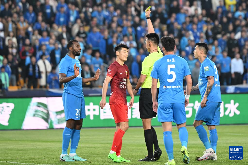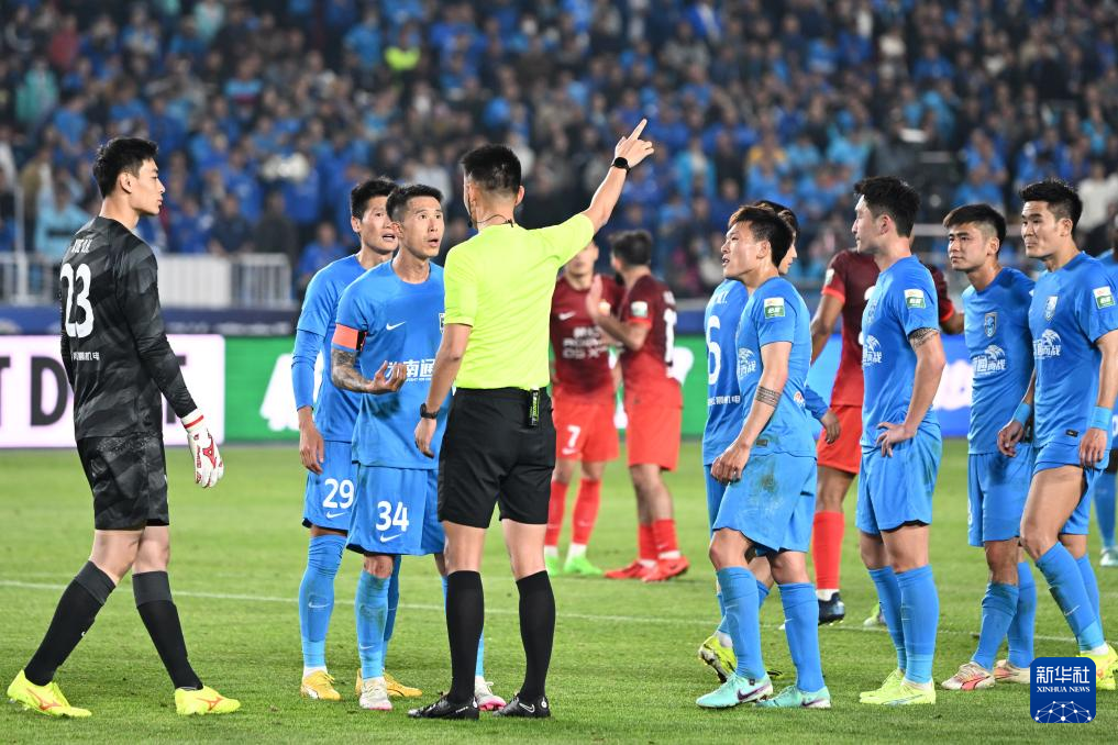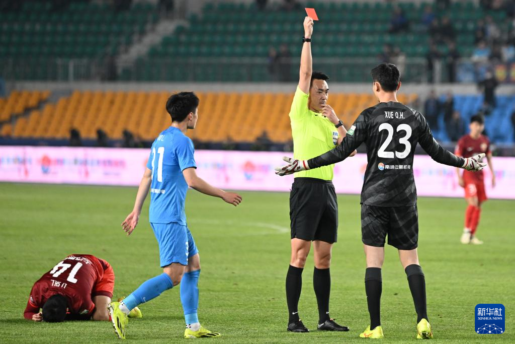 4月9日,主裁判杜健鑫(右二)向南通支云队守门员薛庆浩(右一)出示红牌,随后经VAR(视频助理裁判)确认后取消红牌。新华社发(王须中摄)