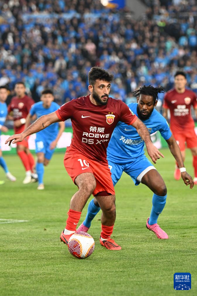 4月9日,上海海港队球员冯劲(左)带球突破。新华社发(王须中摄)