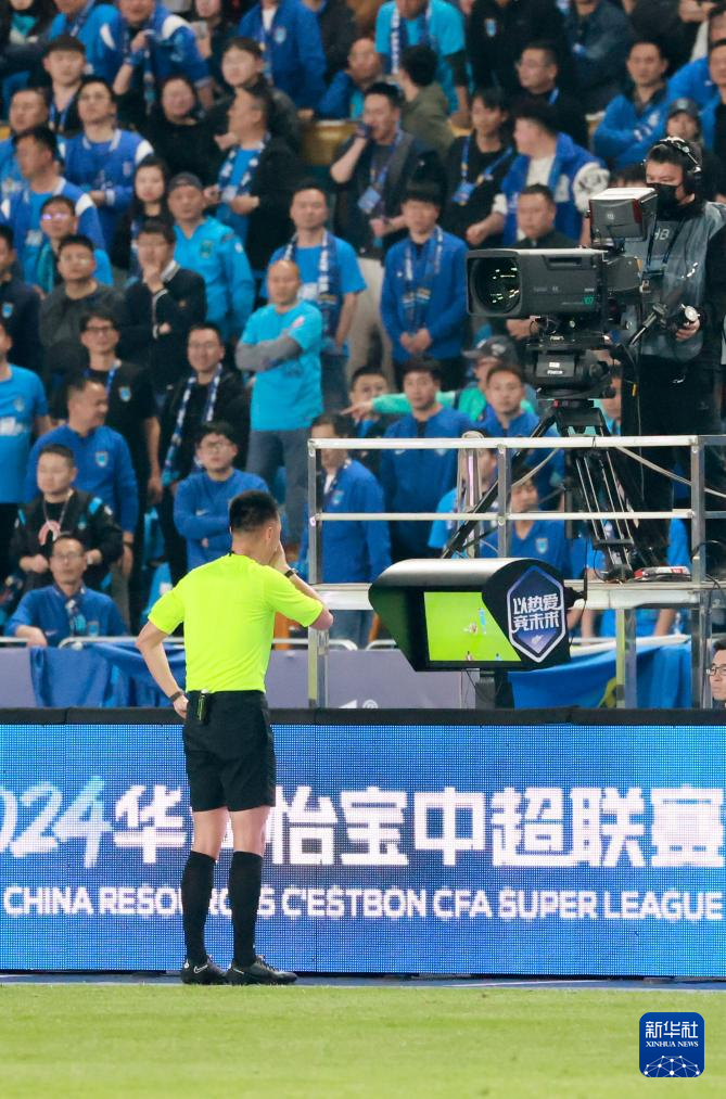 4月9日,主裁判杜健鑫查看VAR(视频助理裁判)。新华社发(邱宇摄)