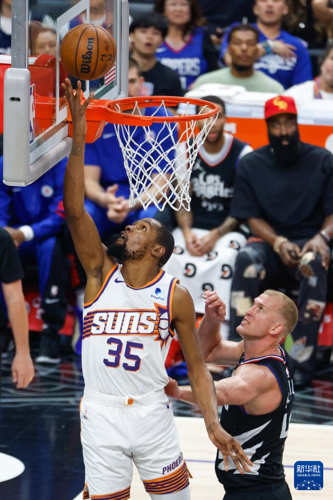 4月10日,太阳队球员凯文·杜兰特(左)在比赛中上篮。新华社发(赵汉荣摄)