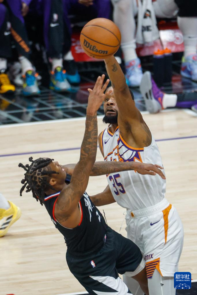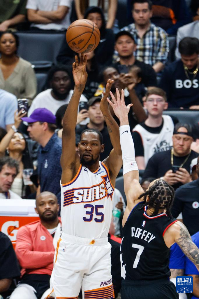 4月10日,太阳队球员凯文·杜兰特(左)在比赛中投篮。新华社发(赵汉荣摄)