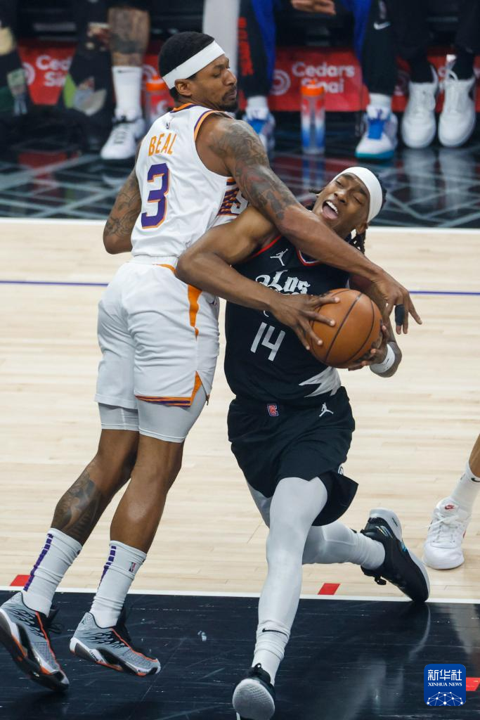 4月10日,快船队球员特伦斯·曼恩(右)在太阳队球员布拉德利·比尔的防守下进攻。新华社发(赵汉荣摄)