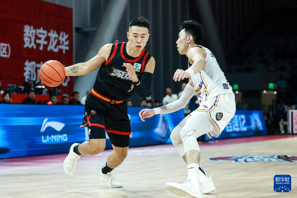 4月10日,北京控股队球员邹雨宸(前左)在比赛中持球进攻。新华社发(彭志刚摄)