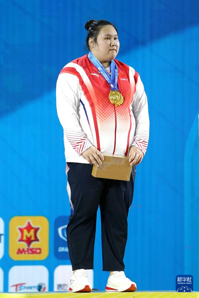 4月10日,冠军中国选手李雯雯在颁奖仪式上。她以抓举145公斤、挺举180公斤、总成绩325公斤收获三枚金牌。新华社记者 王腾 摄