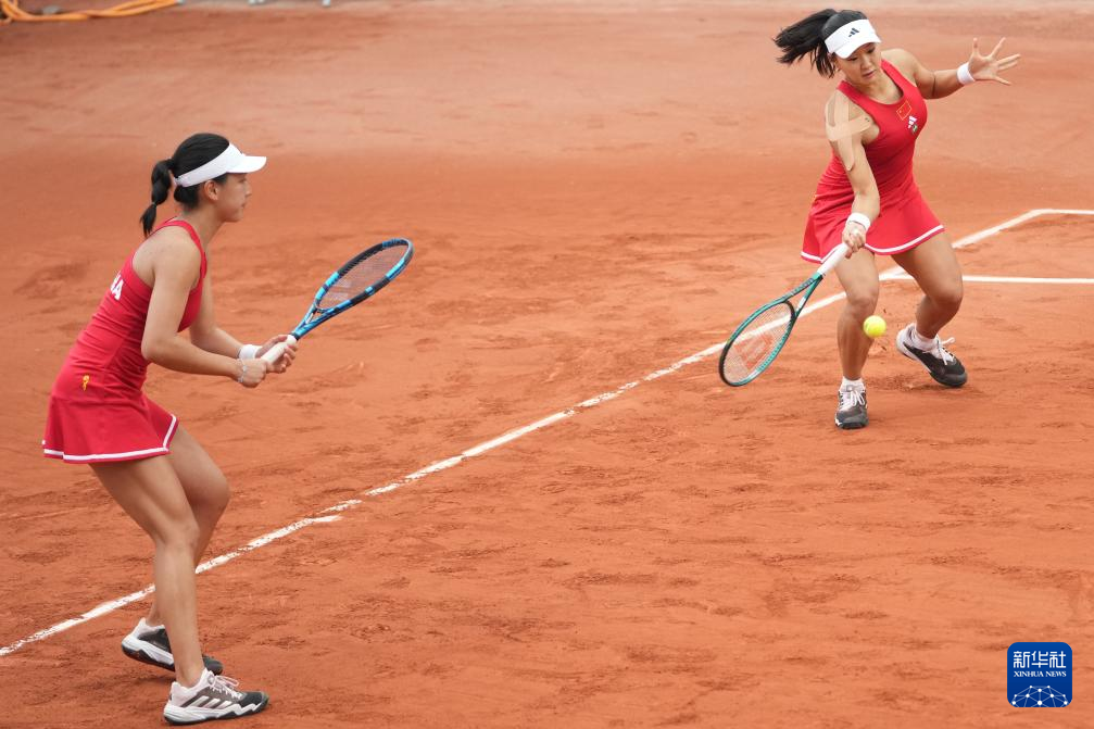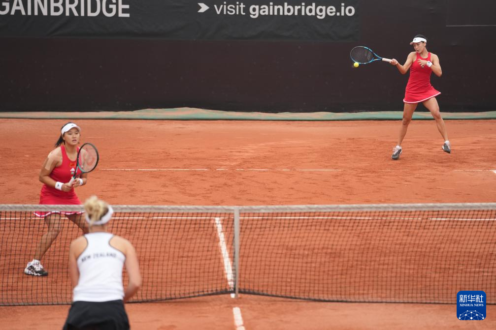 4月11日,中国队组合郭涵煜/王欣瑜(右)在双打比赛中。她们2比1战胜新西兰队组合卢特利芙/孙璐璐。新华社记者 薛宇舸 摄