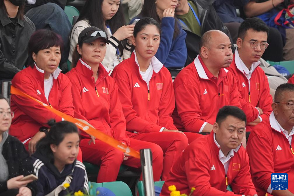 4月11日,中国队选手王欣瑜(上排中)和父亲王鹏(上排右二)在看台上观看比赛。新华社记者 薛宇舸 摄