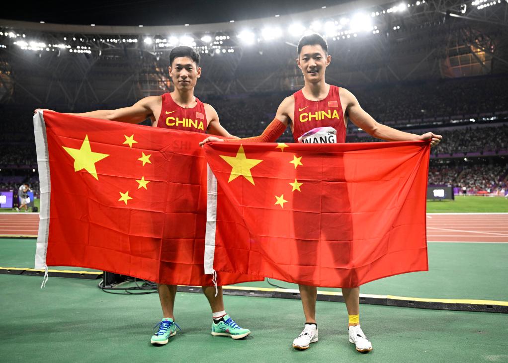 2023年10月1日,中国选手王嘉男(右)和石雨豪在赛后庆祝。当日,杭州亚运会田径项目男子跳远决赛在杭州奥体中心体育场举行。新华社记者 宋彦桦 摄