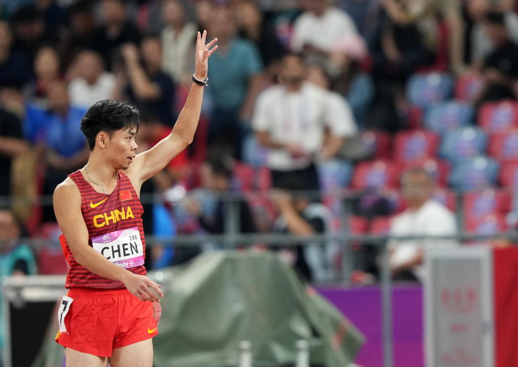 2023年9月30日,中国选手陈冠锋在比赛前。当日,杭州亚运会田径项目男子100米半决赛在杭州奥体中心体育场举行。新华社记者 李一博 摄