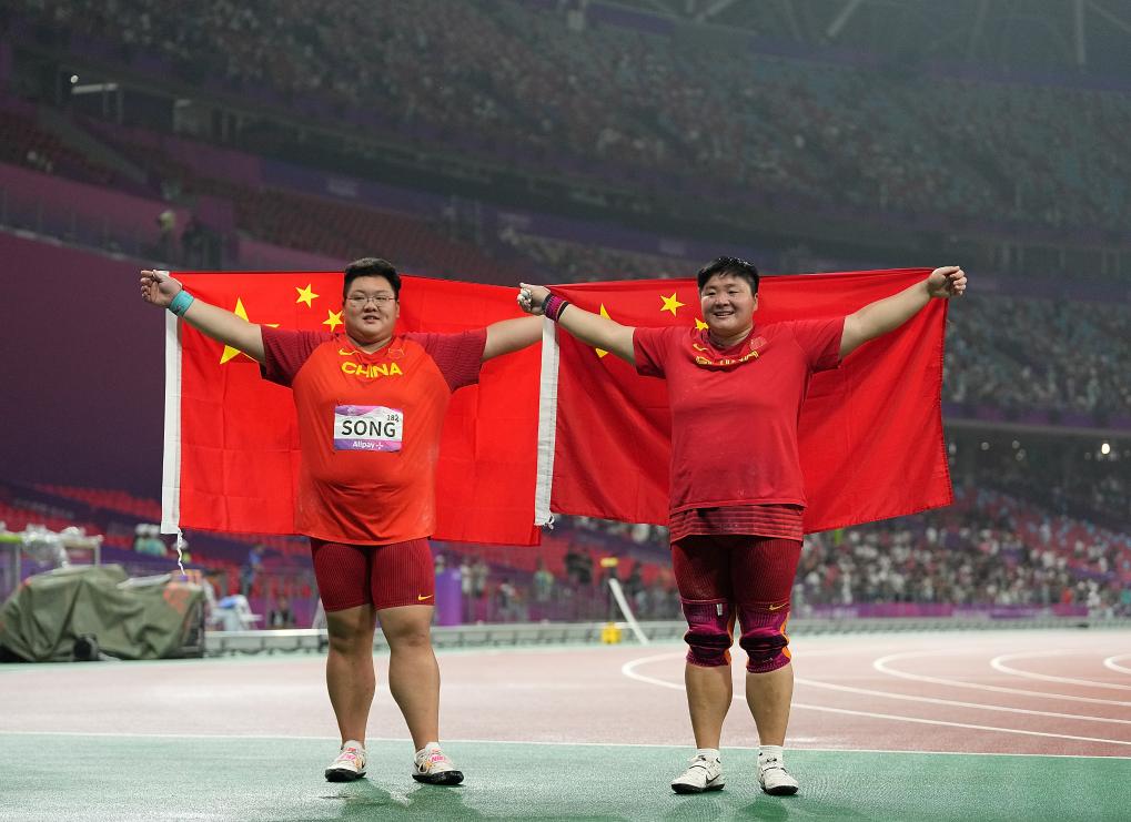 2023年9月29日,冠军中国选手巩立姣(右)、亚军中国选手宋佳媛在比赛后庆祝。当日,杭州亚运会田径项目女子铅球决赛在杭州奥体中心体育场举行。新华社记者 孙非 摄