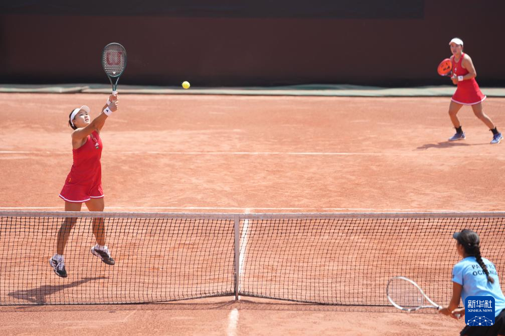 4月12日,中国队组合郭涵煜(左)/朱琳在双打比赛中回球。她们2比0战胜太平洋大洋洲联队组合布西/舒斯特。新华社记者 薛宇舸 摄