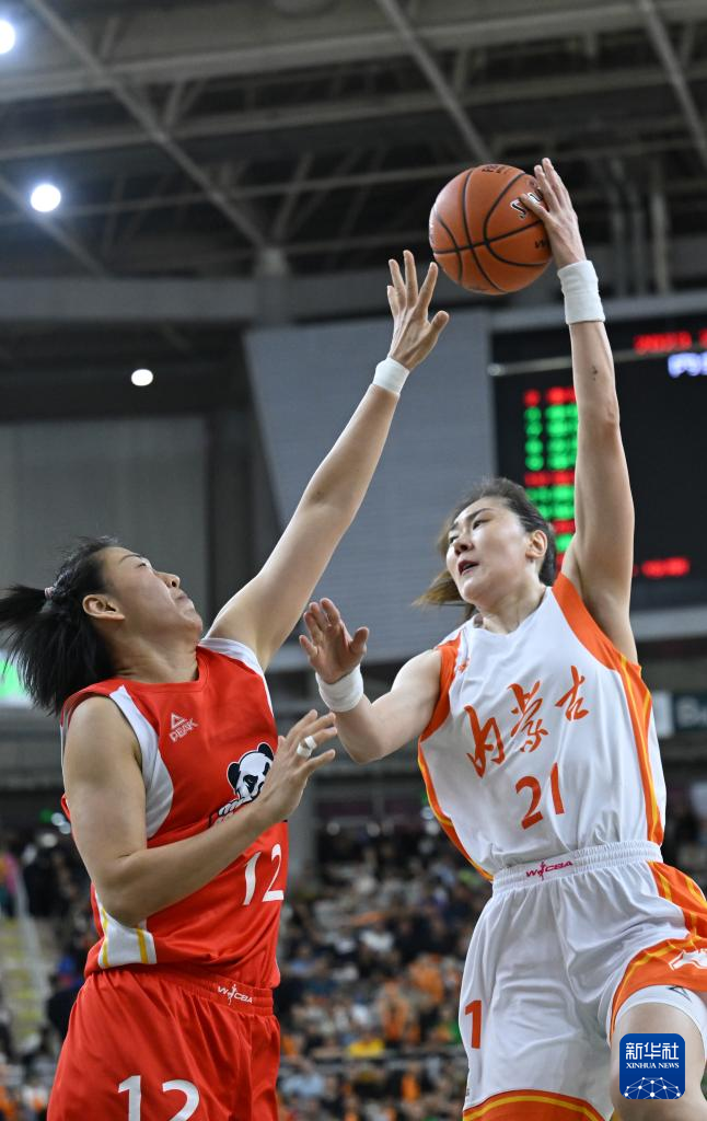 4月11日,内蒙古农信队球员孙梦然(右)在比赛中上篮。新华社记者 连振 摄
