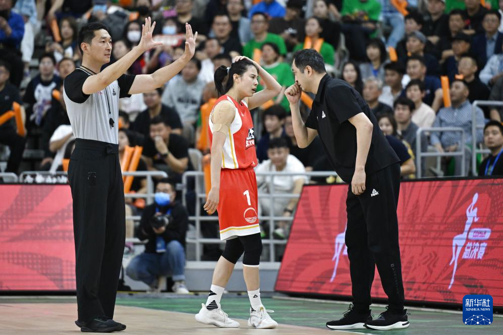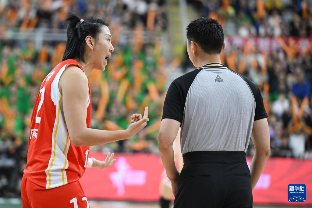 4月11日,四川远达美乐队球员李梦(右)在比赛中与裁判交流。新华社记者 连振 摄