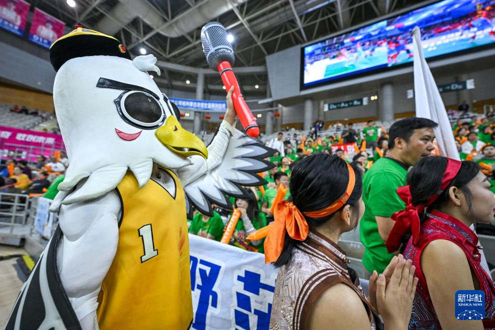 4月11日,内蒙古农信队吉祥物在场边与球迷互动。新华社记者 连振 摄