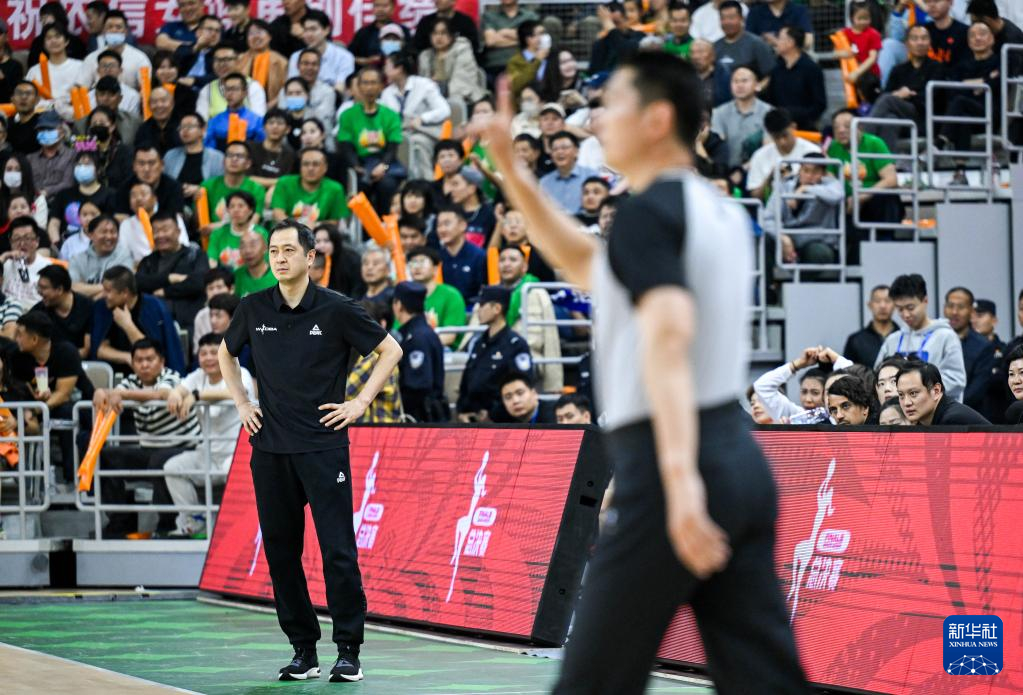 4月11日,四川远达美乐队教练杨毅(左)在比赛中被判罚技术犯规。新华社记者 连振 摄