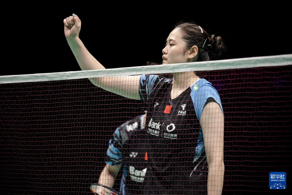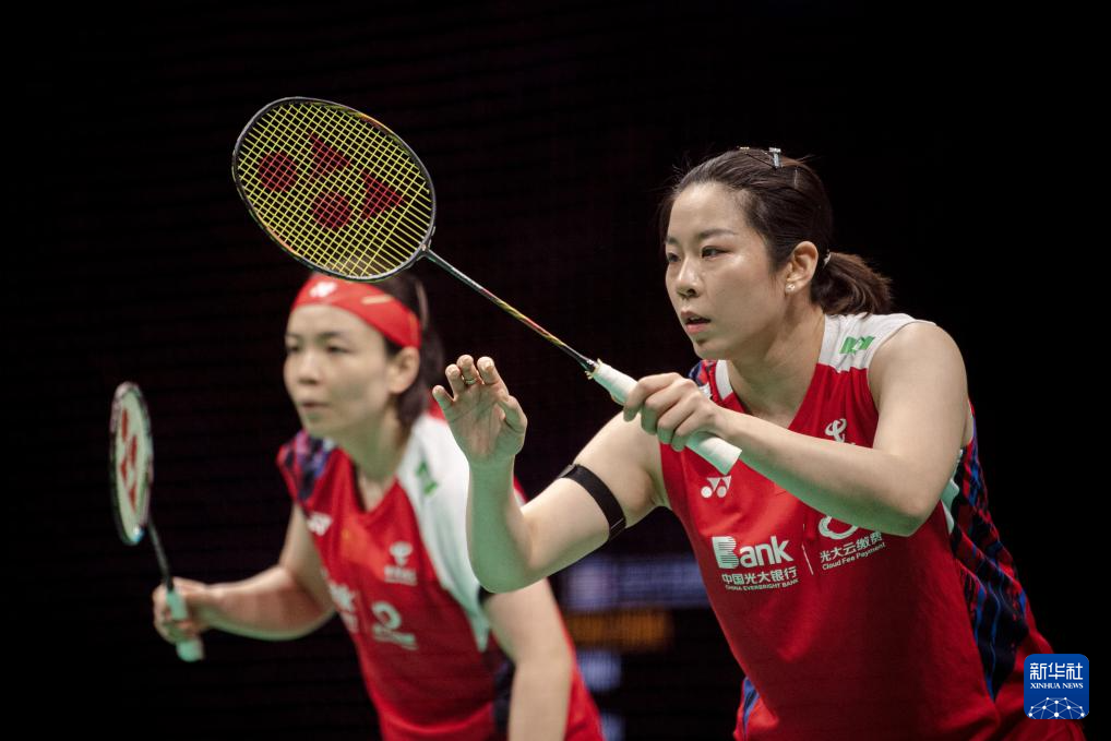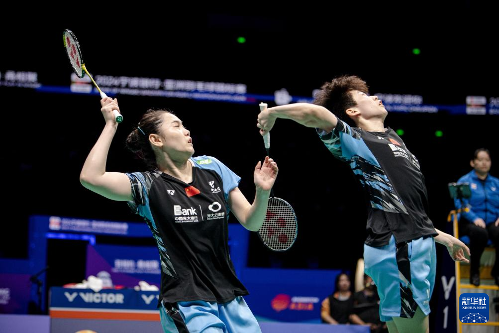 4月13日,中国组合张殊贤(右)/郑雨在女子双打半决赛中,最终她们2比0战胜中国组合陈清晨/贾一凡,晋级决赛。新华社记者 江汉 摄
