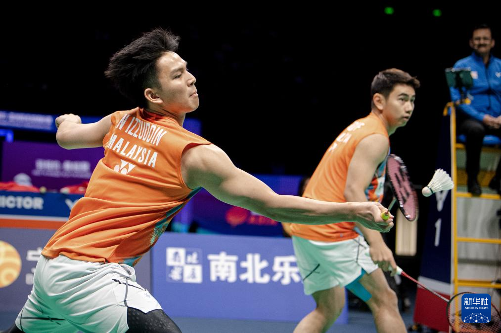 4月13日,马来西亚组合吴世飞/伊祖丁(左)在男子双打半决赛中,最终他们2比0战胜马来西亚组合谢定峰/苏伟译,晋级决赛。新华社记者 江汉 摄