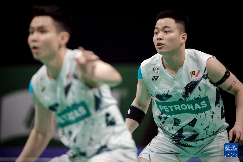 4月13日,马来西亚组合谢定峰(右)/苏伟译在男子双打半决赛中,最终他们0比2不敌马来西亚组合吴世飞/伊祖丁,无缘决赛。新华社记者 江汉 摄