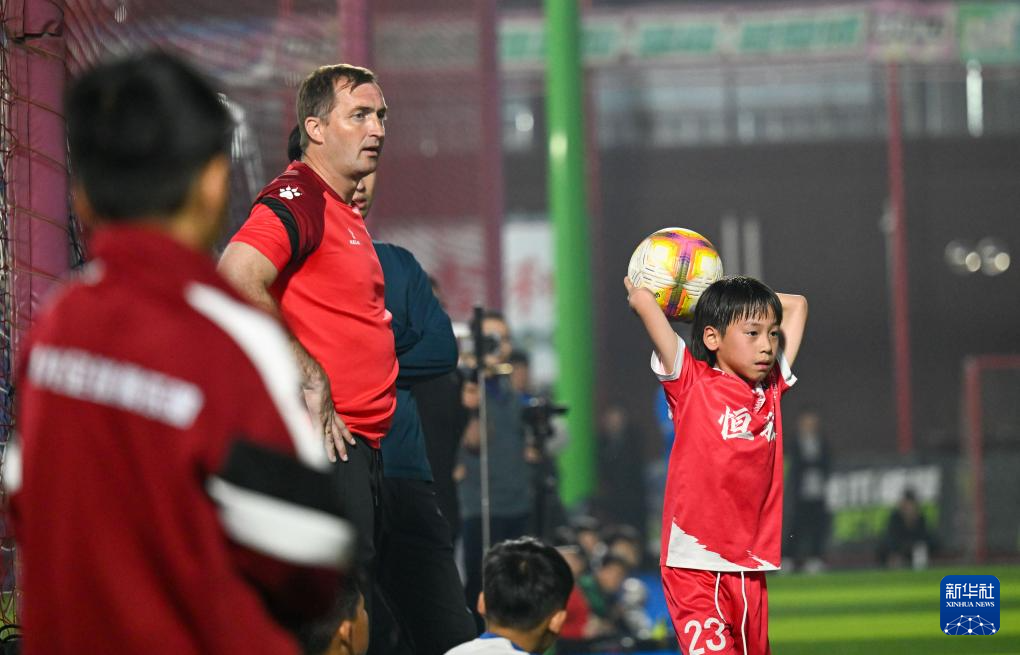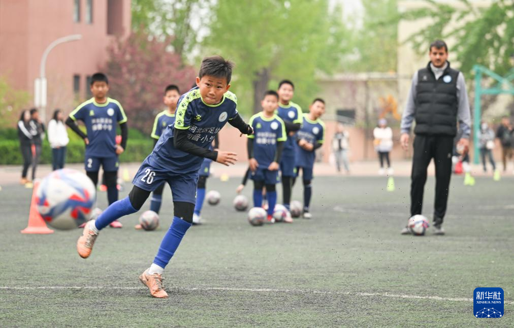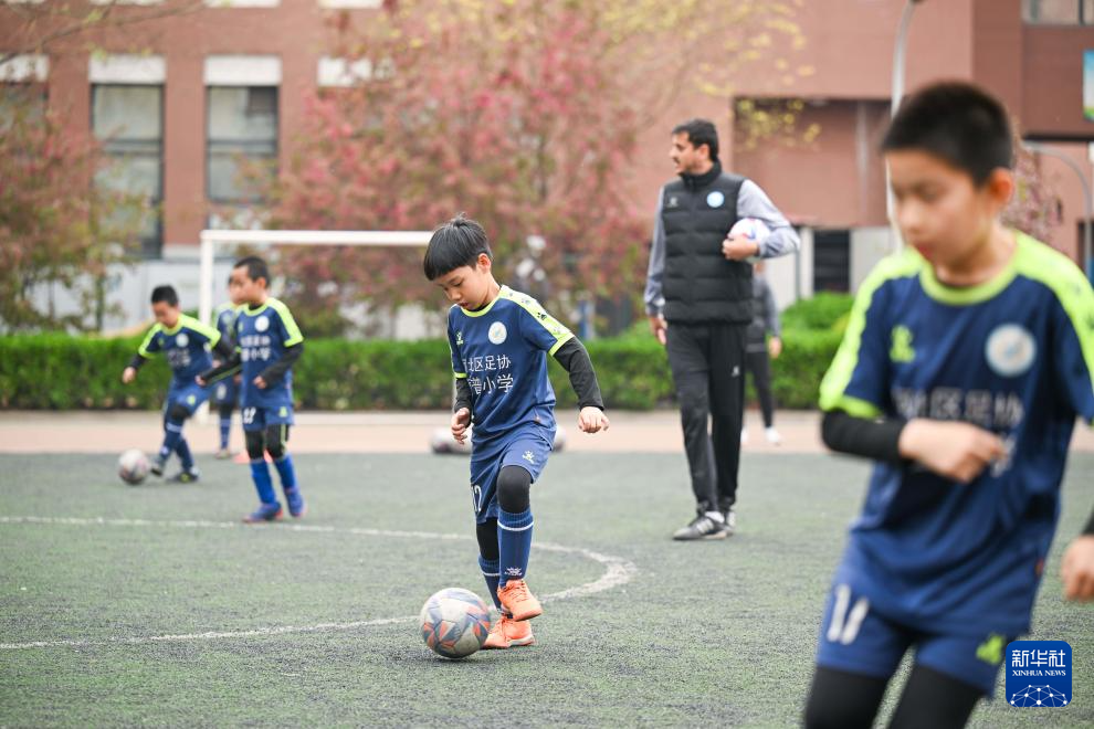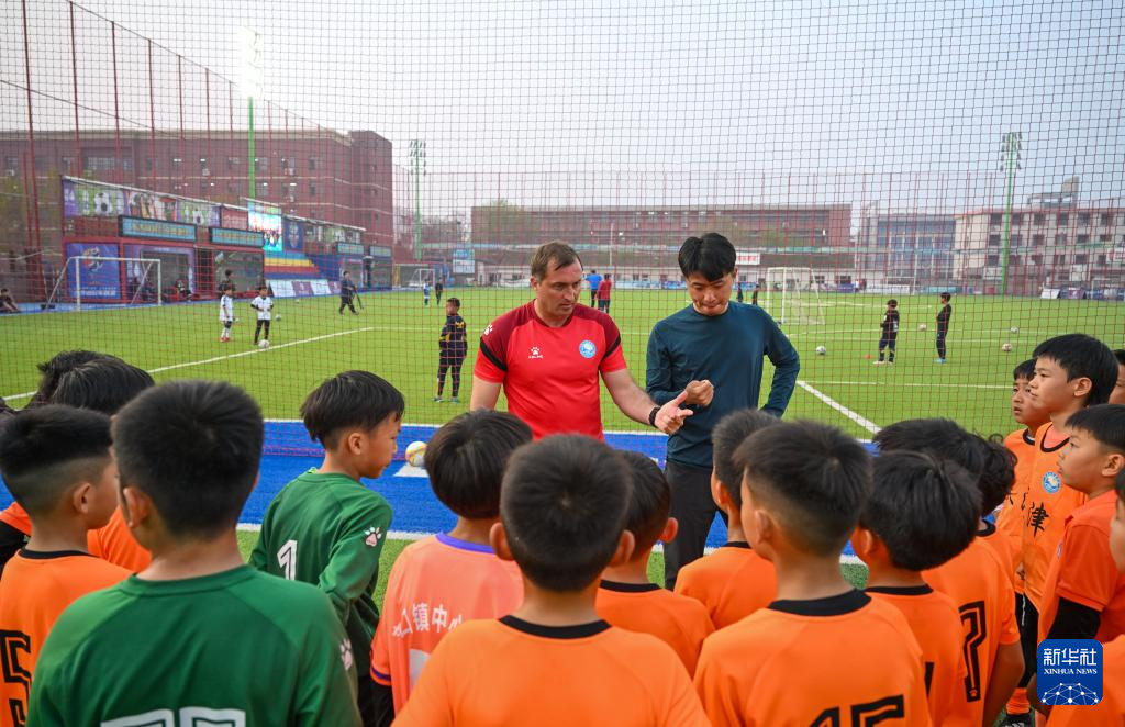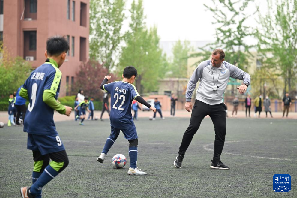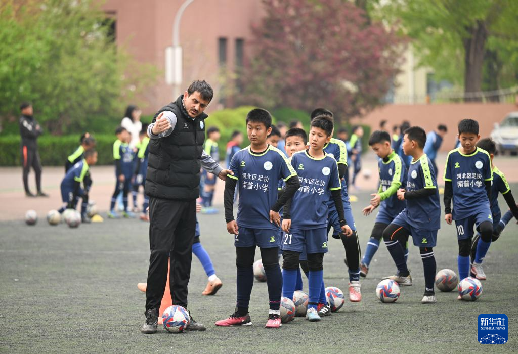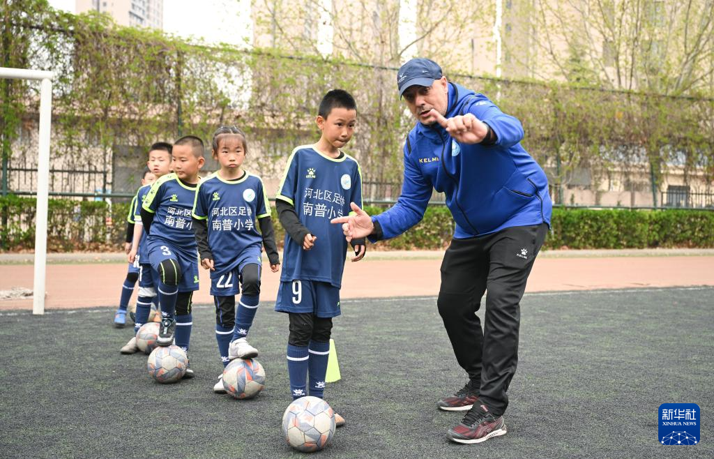 在天津外国语学校南普小学,西班牙籍足球教练佩德罗·诺奎拉(右一)指导小球员训练(4月10日摄)。新华社记者 孙凡越 摄