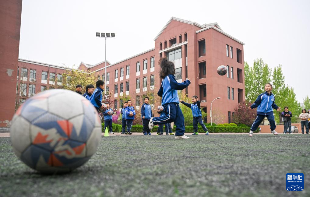 天津外国语学校南普小学的小球员们在塞尔维亚籍足球教练阿伦·查卡拉(右二)带领下训练(4月10日摄)。新华社记者 孙凡越 摄