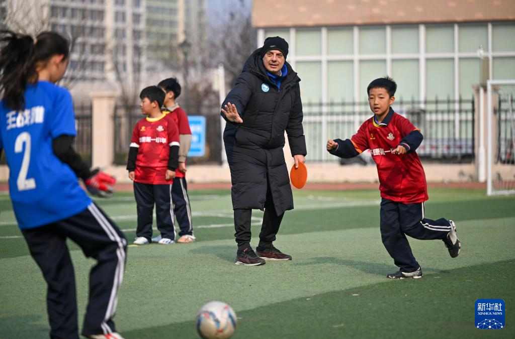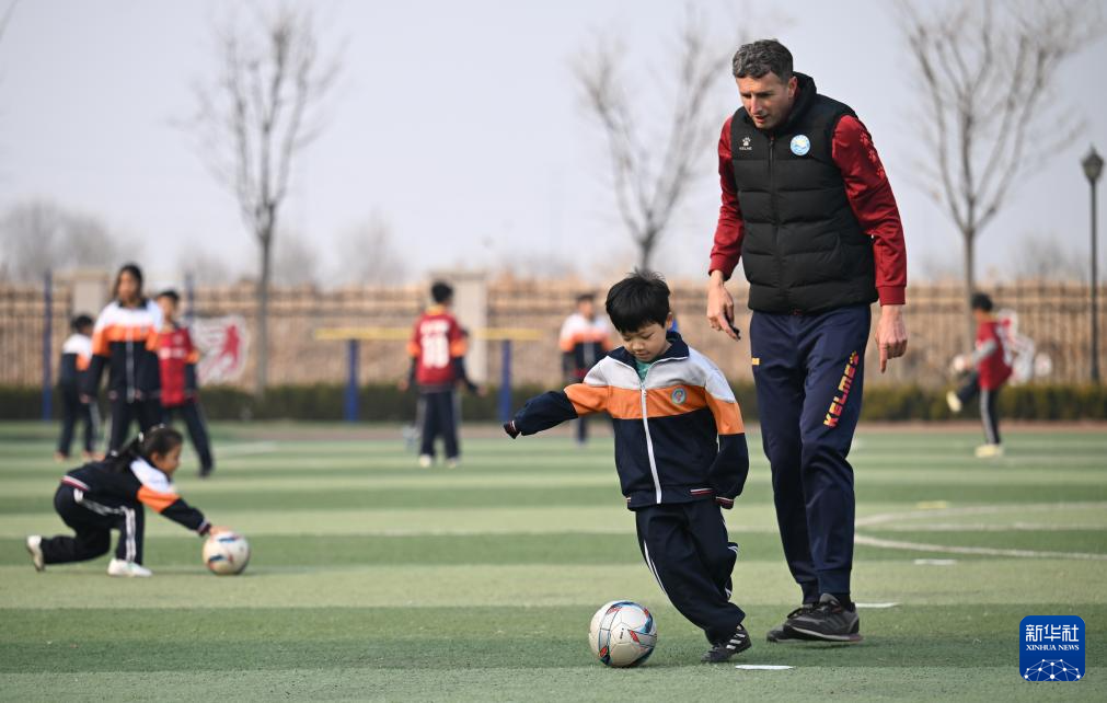 塞尔维亚籍足球教练亚历山大·潘蒂奇(右)在天津市静海区华康街道第一小学指导小球员进行足球盘带(3月6日摄)。新华社记者 孙凡越 摄