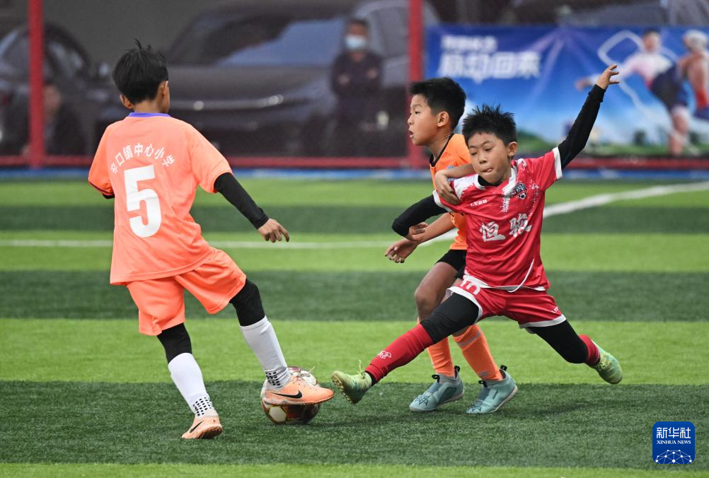 天津外国语学校南普小学的小球员张赫桐(左)在训练中射门,随后他被天津市足协聘请的外籍教练选中,进入天津市足协青训中心下的青少年球队训练(4月10日摄)。新华社记者 孙凡越 摄