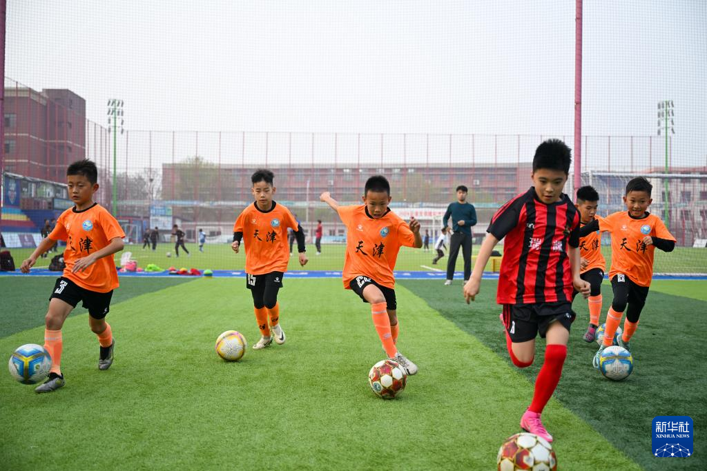 在天津市足协青训基地,天津市足协青训中心的青少年球员进行训练(4月11日摄)。新华社记者 孙凡越 摄
