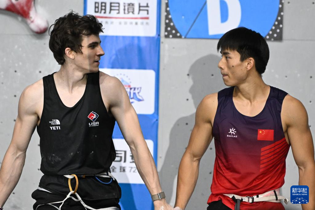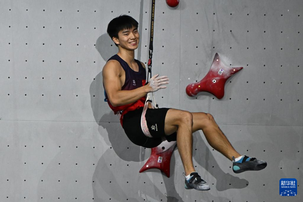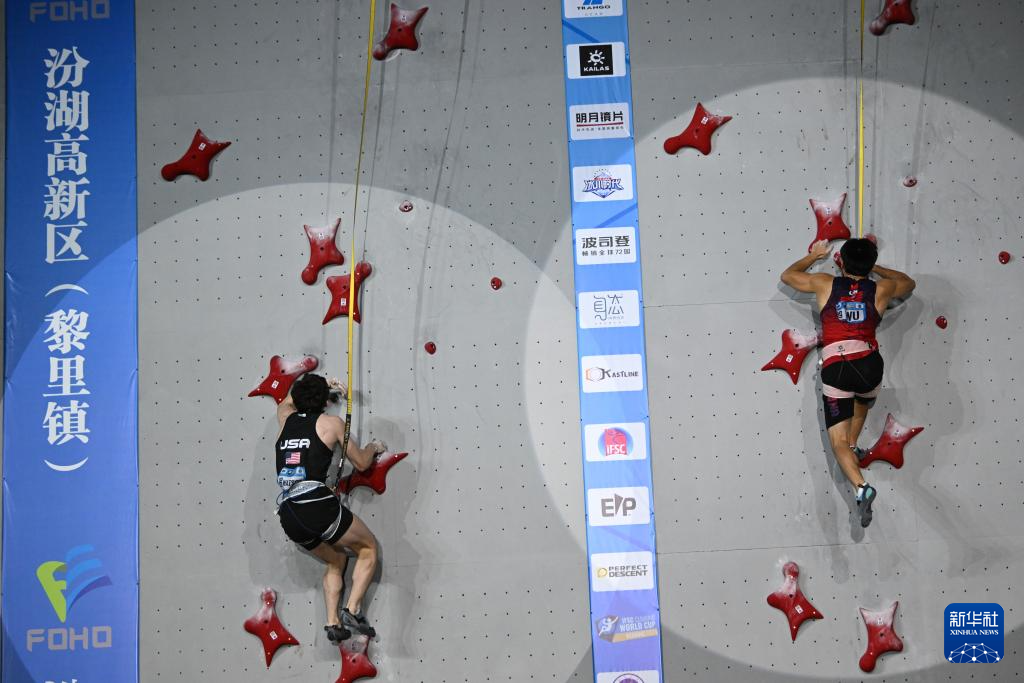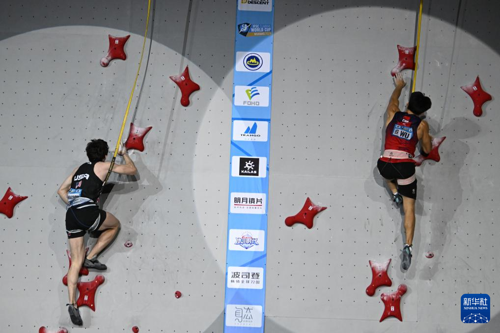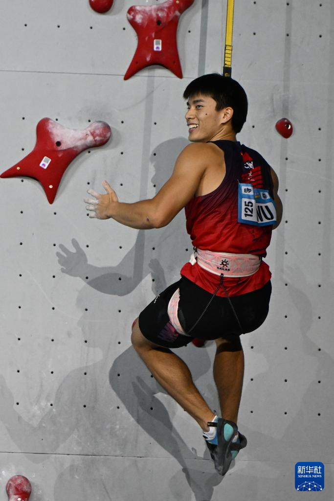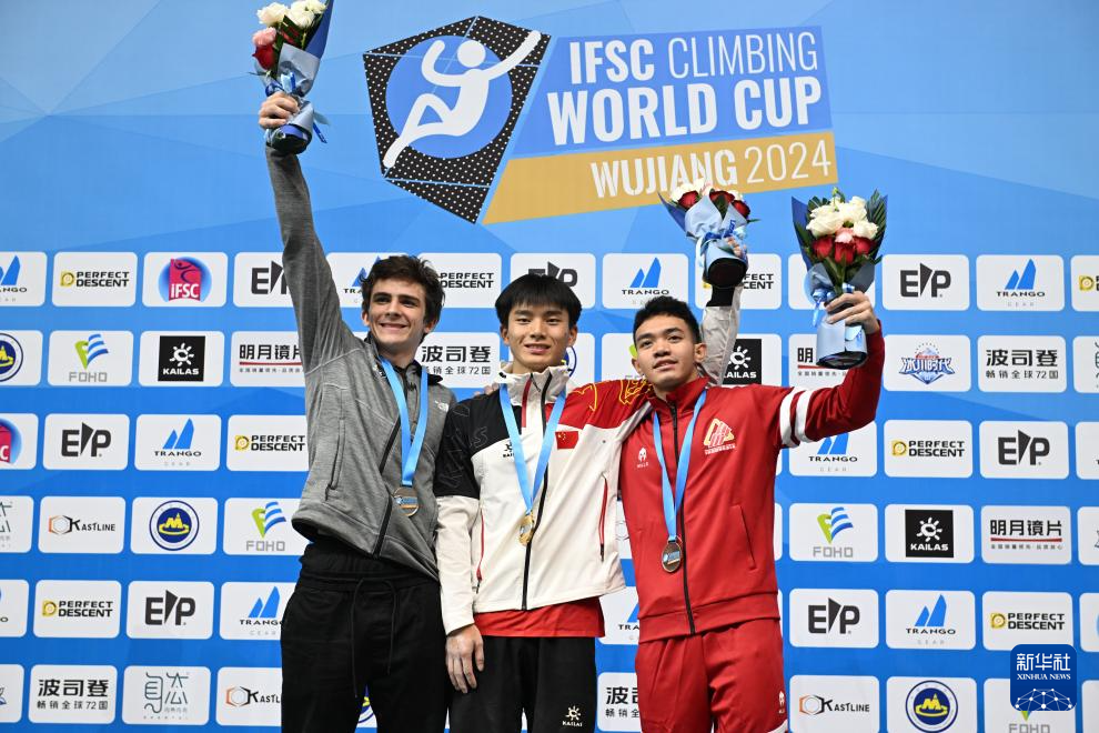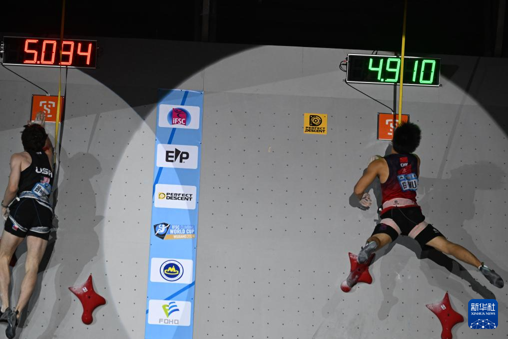 当日, 在江苏吴江举行的2024年国际攀联攀岩世界杯(吴江站)男子速度决赛中,中国选手伍鹏获得冠军。
