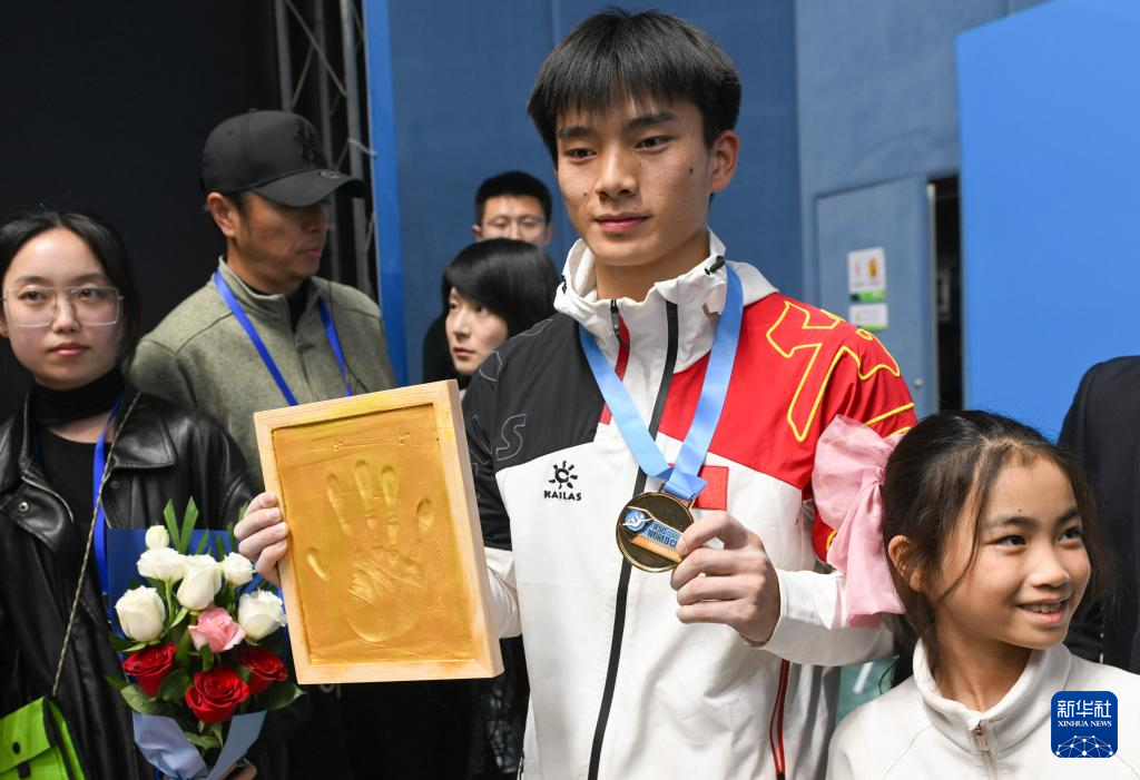 4月13日,冠军中国选手伍鹏在颁奖仪式后。新华社发(王须中摄)