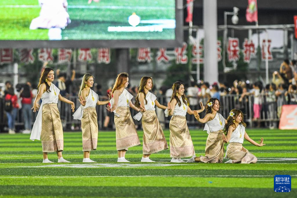 4月13日,贵州大学的留学生们在中场休息时进行歌舞表演并向观众示意。新华社记者 陶亮 摄