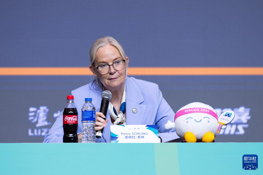 4月14日,国际乒联主席、国际奥委会委员佩特拉·索林在新闻发布会上发言。新华社记者 张金加 摄