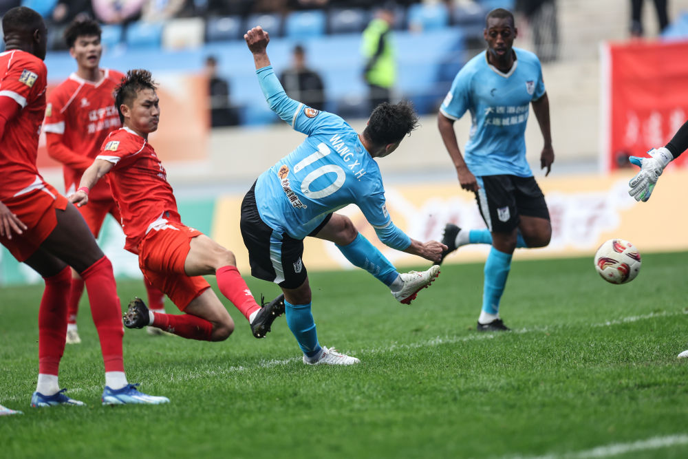 4月13日,大连英博队球员王选宏(右二)射门得分。新华社记者 潘昱龙 摄