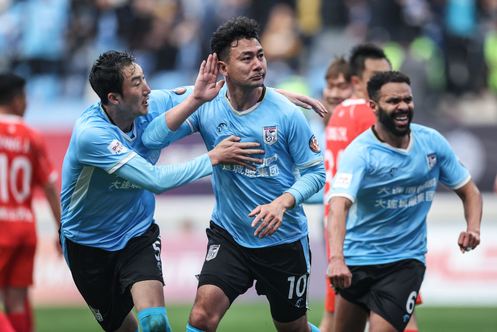 4月13日,大连英博队球员王选宏(前中)进球后庆祝。新华社记者 潘昱龙 摄