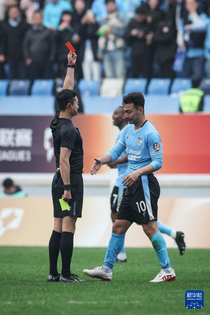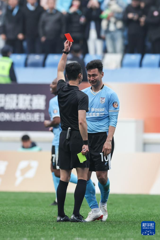 4月13日,大连英博队球员王选宏(右)在比赛中打入绝杀球后,被主裁判出示红牌。新华社记者 潘昱龙 摄