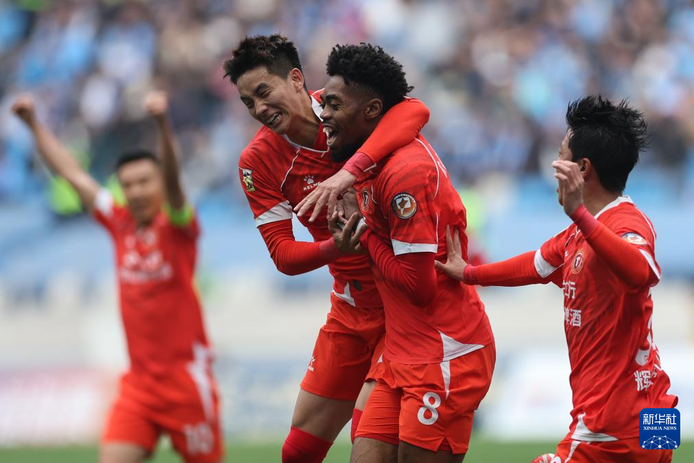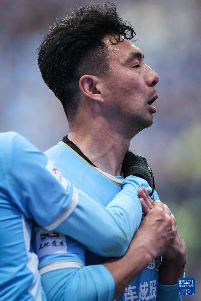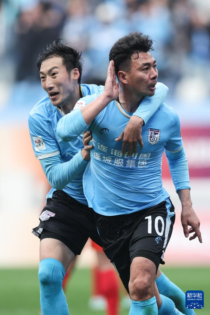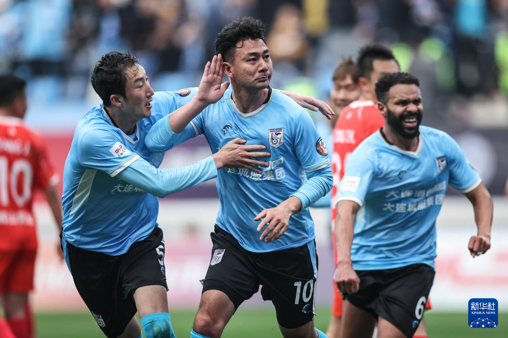 4月13日,大连英博队球员王选宏进球后庆祝。新华社记者 潘昱龙 摄