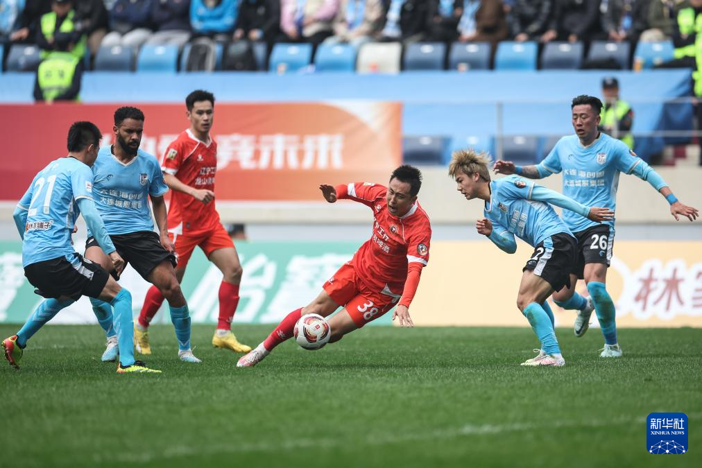 4月13日,大连英博队球员王选宏(右二)射门得分。新华社记者 潘昱龙 摄