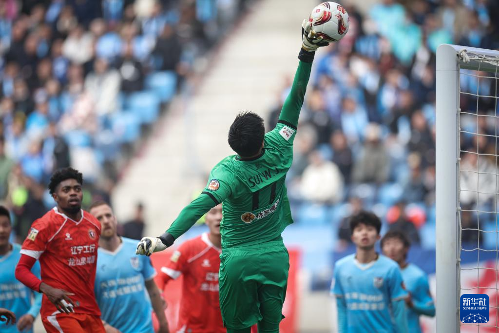 4月13日,大连英博队守门员隋维杰(前)在比赛中扑救。新华社记者 潘昱龙 摄