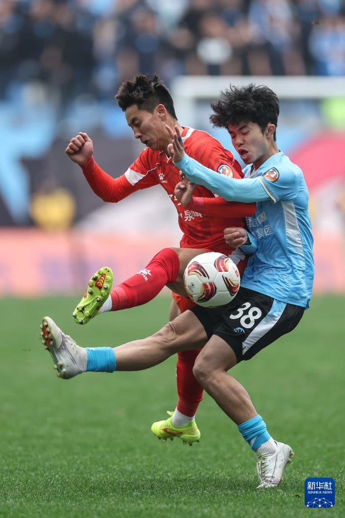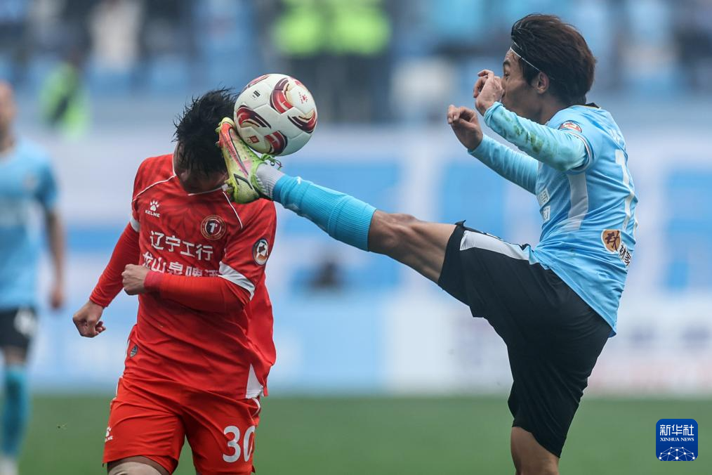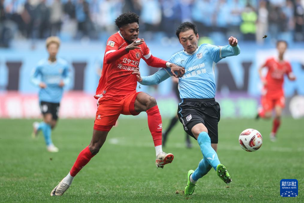 4月13日,大连英博队球员和晓强(右)与辽宁铁人队球员钱军豪拼抢。新华社记者 潘昱龙 摄