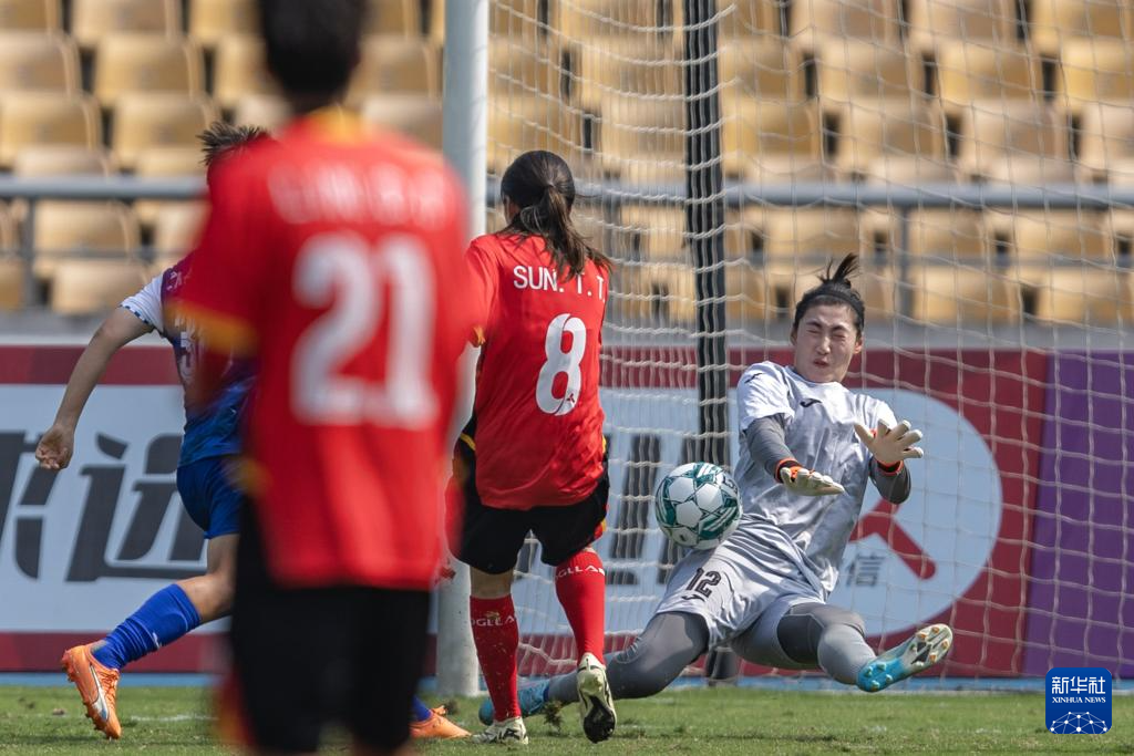 4月13日,广东女足队守门员彭诗梦(右一)防守永川茶山竹海橙狮女足队球员孙婷婷(右二)的射门。新华社记者 黄伟 摄
