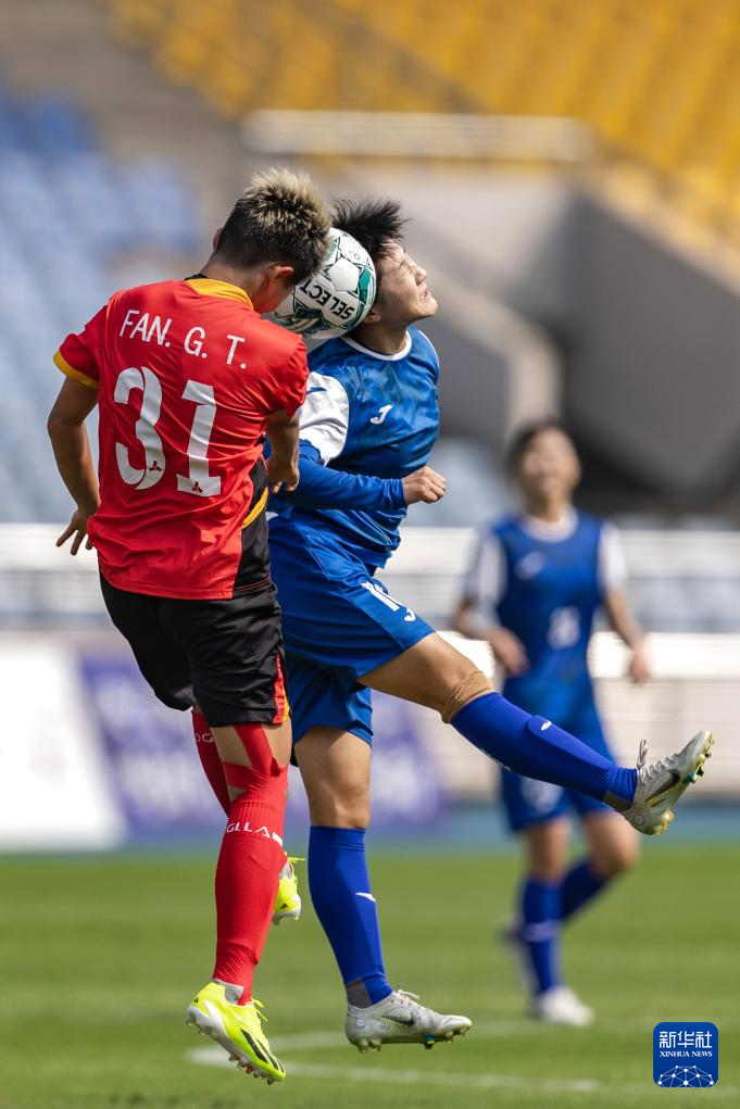 4月13日,永川茶山竹海橙狮女足队球员凡广婷(左)与广东女足队球员刘宣池争顶头球。新华社记者 黄伟 摄