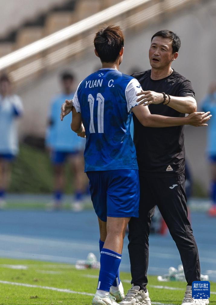 4月13日,广东女足队球员袁丛(左)在进球后与教练拥抱庆祝。新华社记者 黄伟 摄