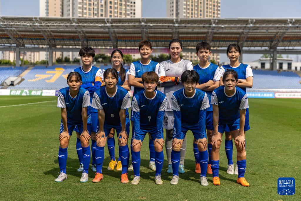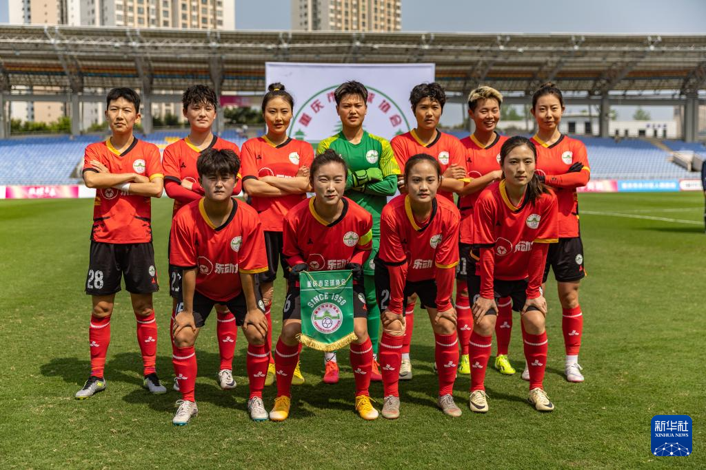 4月13日,永川茶山竹海橙狮女足队首发球员在比赛前合影。新华社记者 黄伟 摄