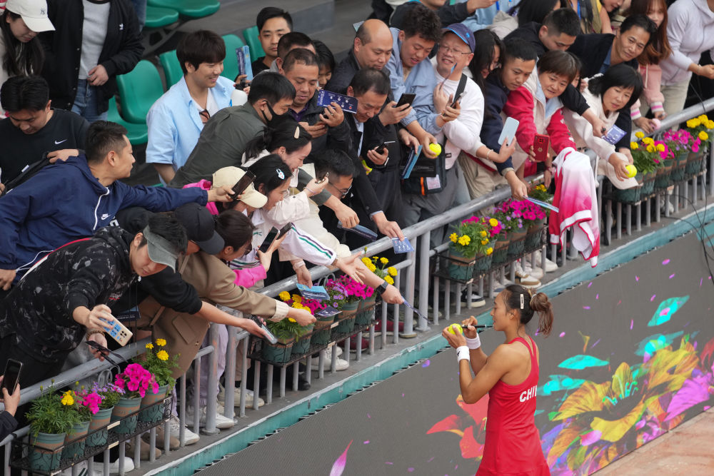 4月10日,中国队选手郑钦文(下)在比赛后为球迷签名。新华社记者 薛宇舸 摄