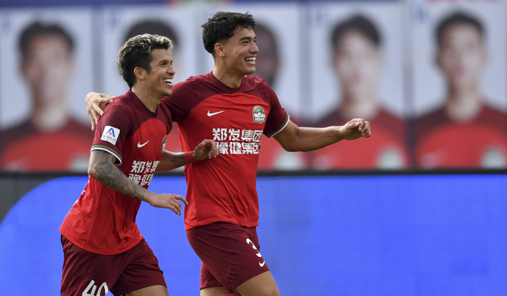 4月13日,河南队球员周缘德(右)在比赛中庆祝进球。新华社记者 李嘉南 摄