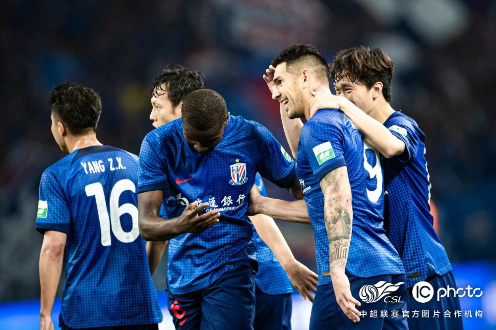 上海申花队球员在比赛中庆祝进球。