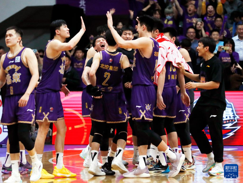 4月13日,北京控股队球员在比赛后庆祝胜利。新华社记者 雒圆 摄