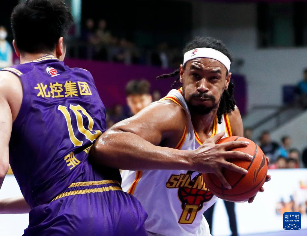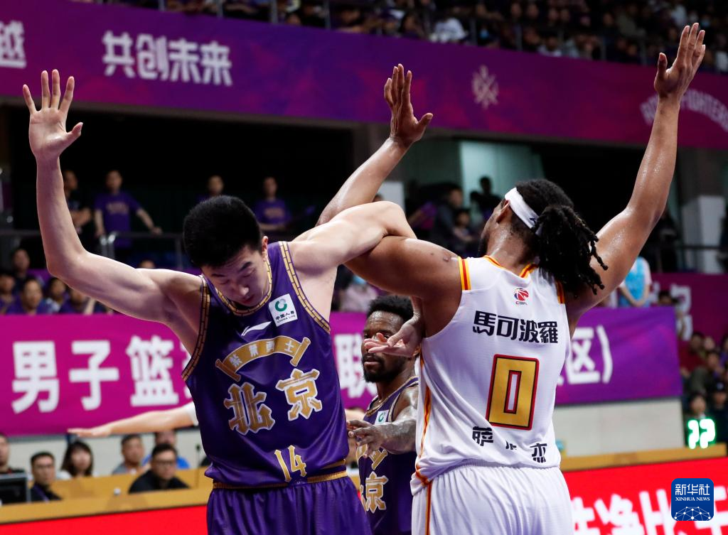 4月13日,北京控股队球员王少杰(左)与深圳马可波罗队球员萨林杰在比赛中。新华社记者 雒圆 摄