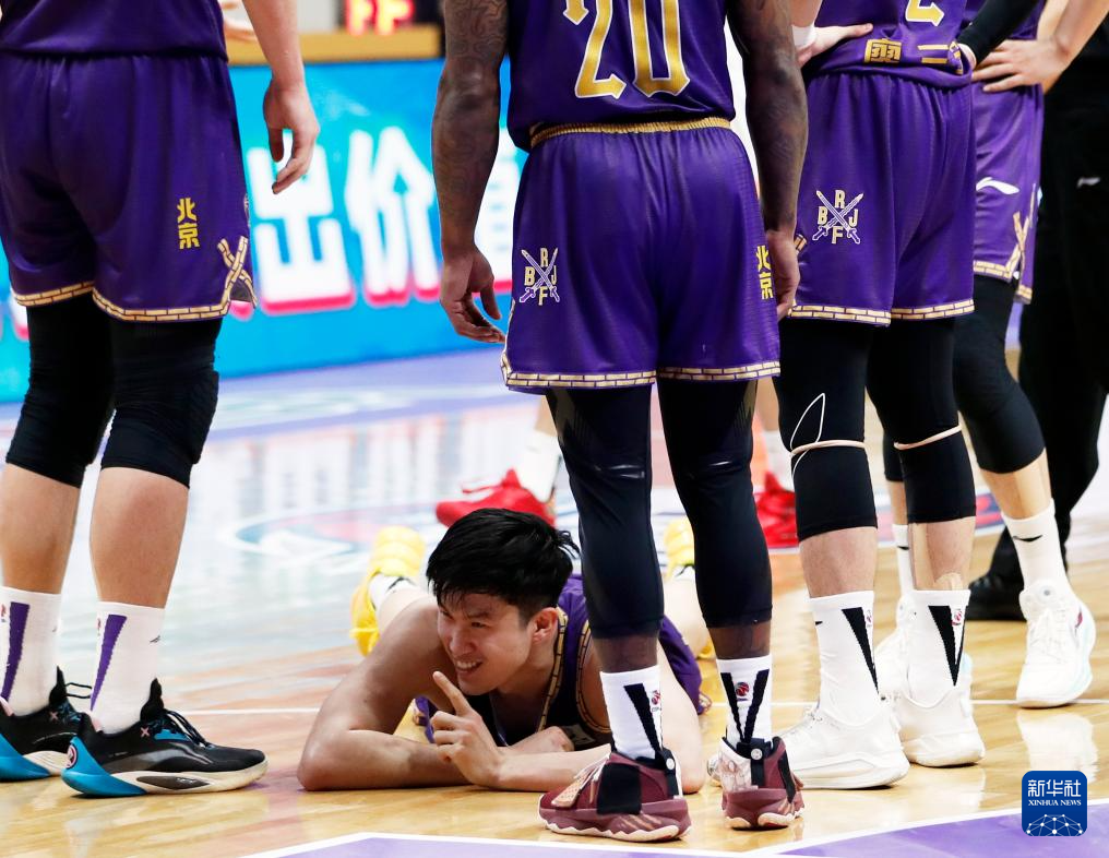 4月13日,北京控股队球员金鑫在比赛中庆祝得分。新华社记者 雒圆 摄