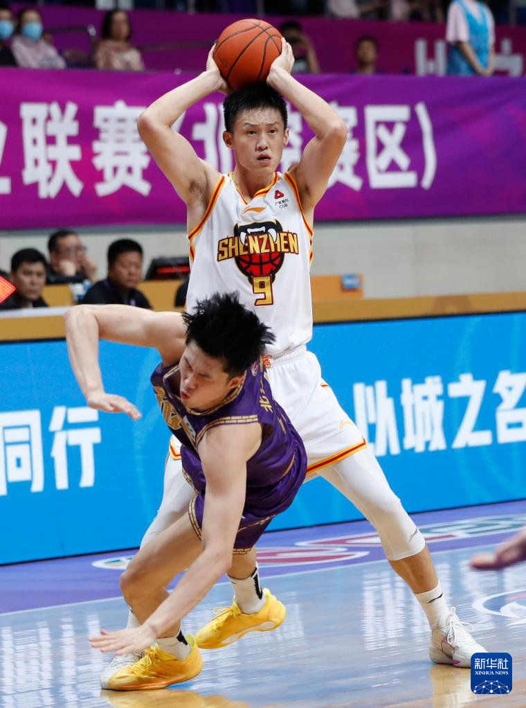 4月13日,深圳马可波罗队球员沈梓捷(右)在比赛中进攻。新华社记者 雒圆 摄